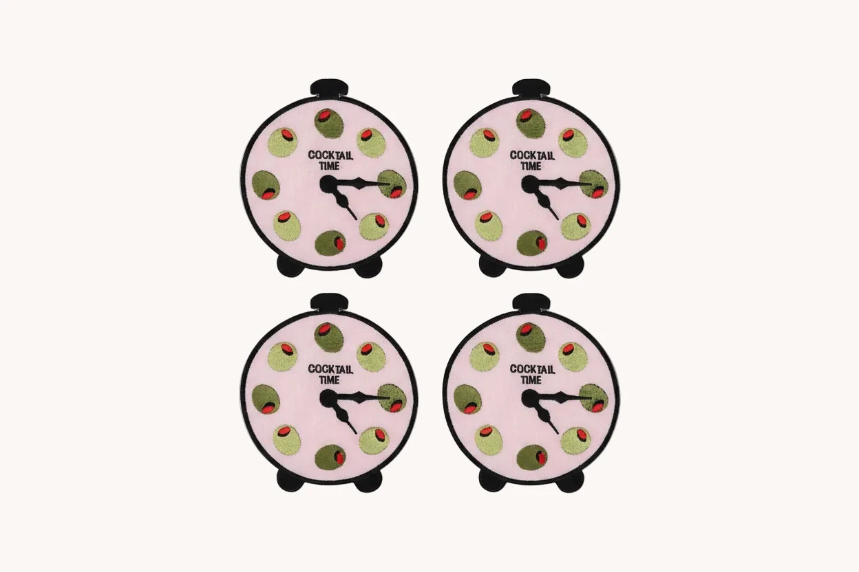 A playful nod to cocktail hour, these linen napkins feature a vintage clock face finished with olive accents—perfect for marking time, one sip at a time.